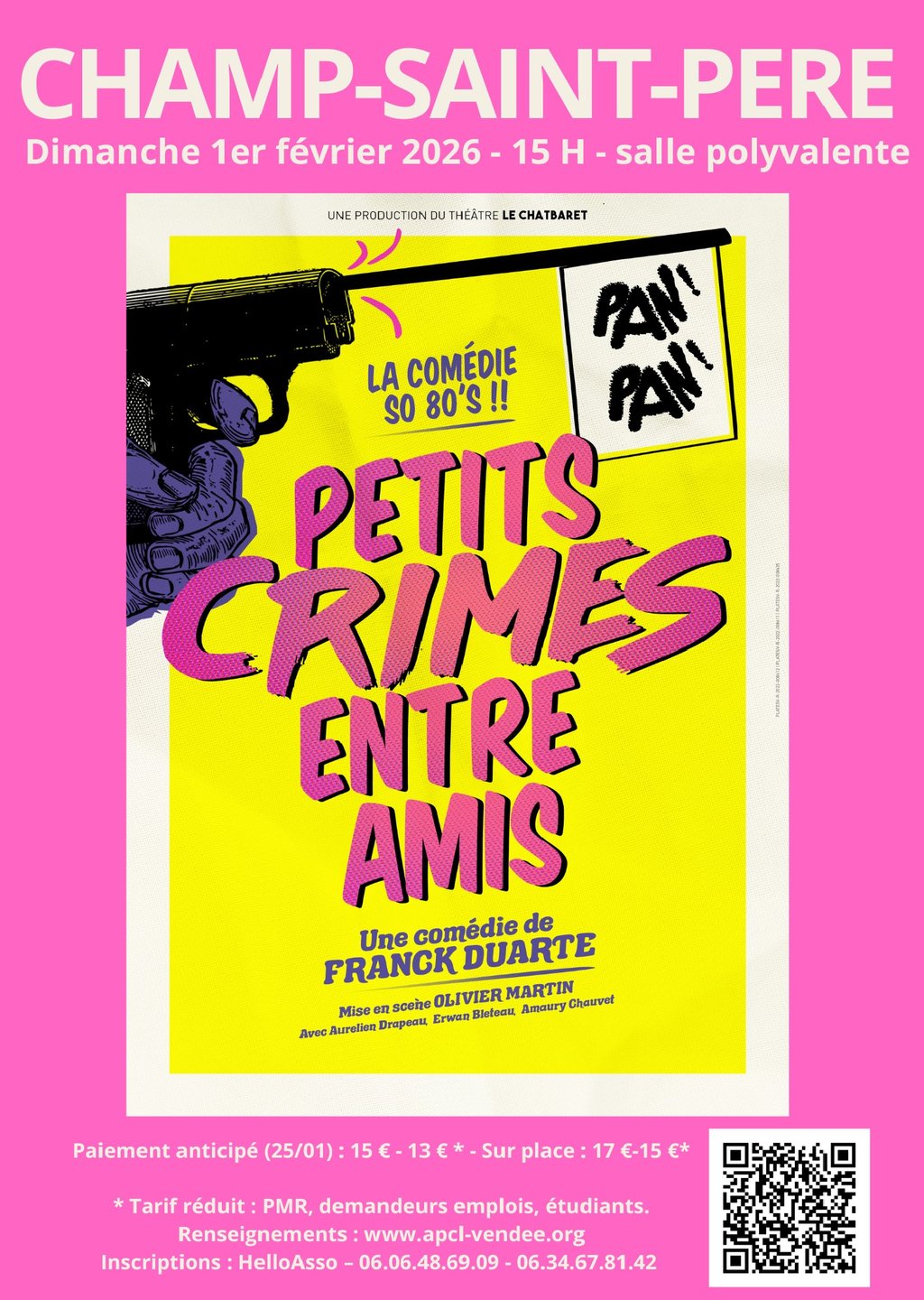 Dimanche 1er février 2026 à 15h00 à la salle polyvalente de Champ-saint-père, pièce de théâtre « Petits crimes entre amis » Inscriptions sur Helloasso