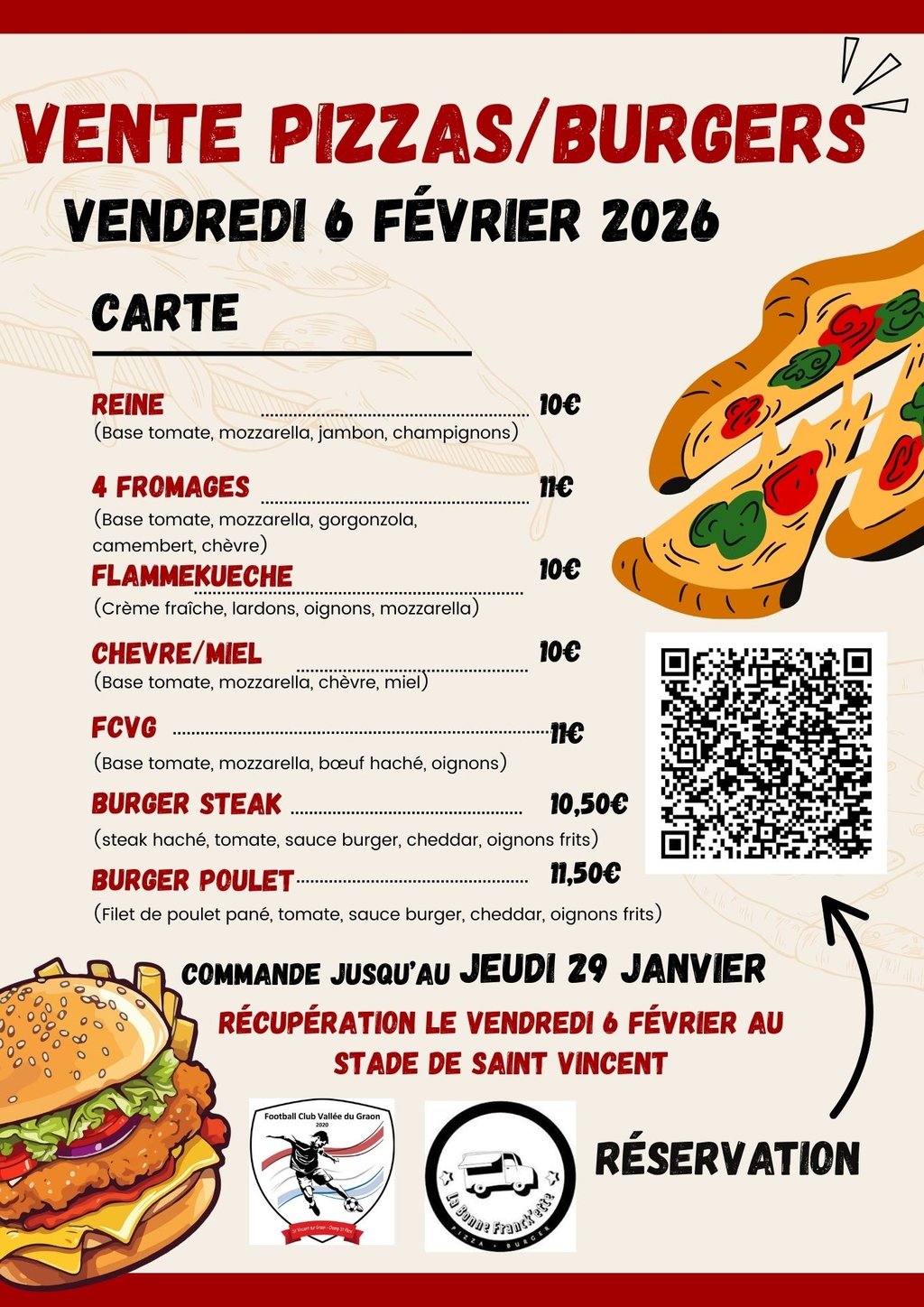Le FCVG vous propose une vente de Pizzas et de burgers le vendredi 06 février 2026 à venir récupérer au stade de Saint Vincent. Commande jusqu’au jeudi 29 janvier 2026.