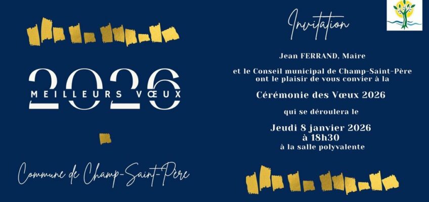 Mr le Maire et le Conseil Municipal de Champ-saint-Père ont le plaisir de vous convier à la cérémonie des vœux 2026 qui se déroulera le jeudi 8 janvier 2026 à la salle polyvalente.