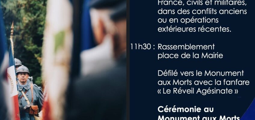 11h30 : Rassemblement place de la Mairie. Défilé vers le Monument aux Morts avec la fanfare « Le Réveil Agésinate »