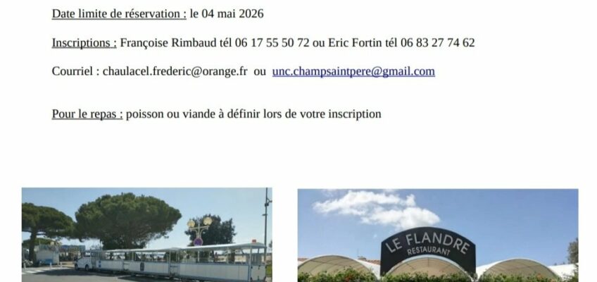 Cette année l Unc de Champ Saint Père organise son voyage annuel dans les environs de Royan. Petit train à Royan, grottes de Regulus, zoo de la Palmyre. Avec un très bon restaurant à Saint Palais sur Mer. Le tout pour 78 € pour les adhérents et 83 € non adhérents.
