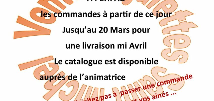 L’association L’Age d’Or met en place une vente de galettes Saint Michel à compter du 10 février 2026 à l’Ehpad Beauséjour. Vous pouvez récupérer le catalogue auprès de l’animatrice Christelle et passer vos commandes jusqu’au 20 mars pour une livraison prévue à la mi-avril.
