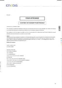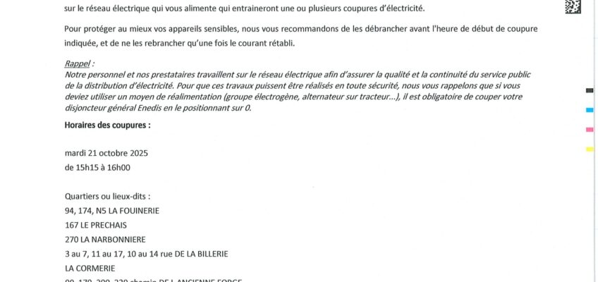 Mardi 21 octobre 2025 de 15h00 à 16h00 coupures de courant pour travaux: